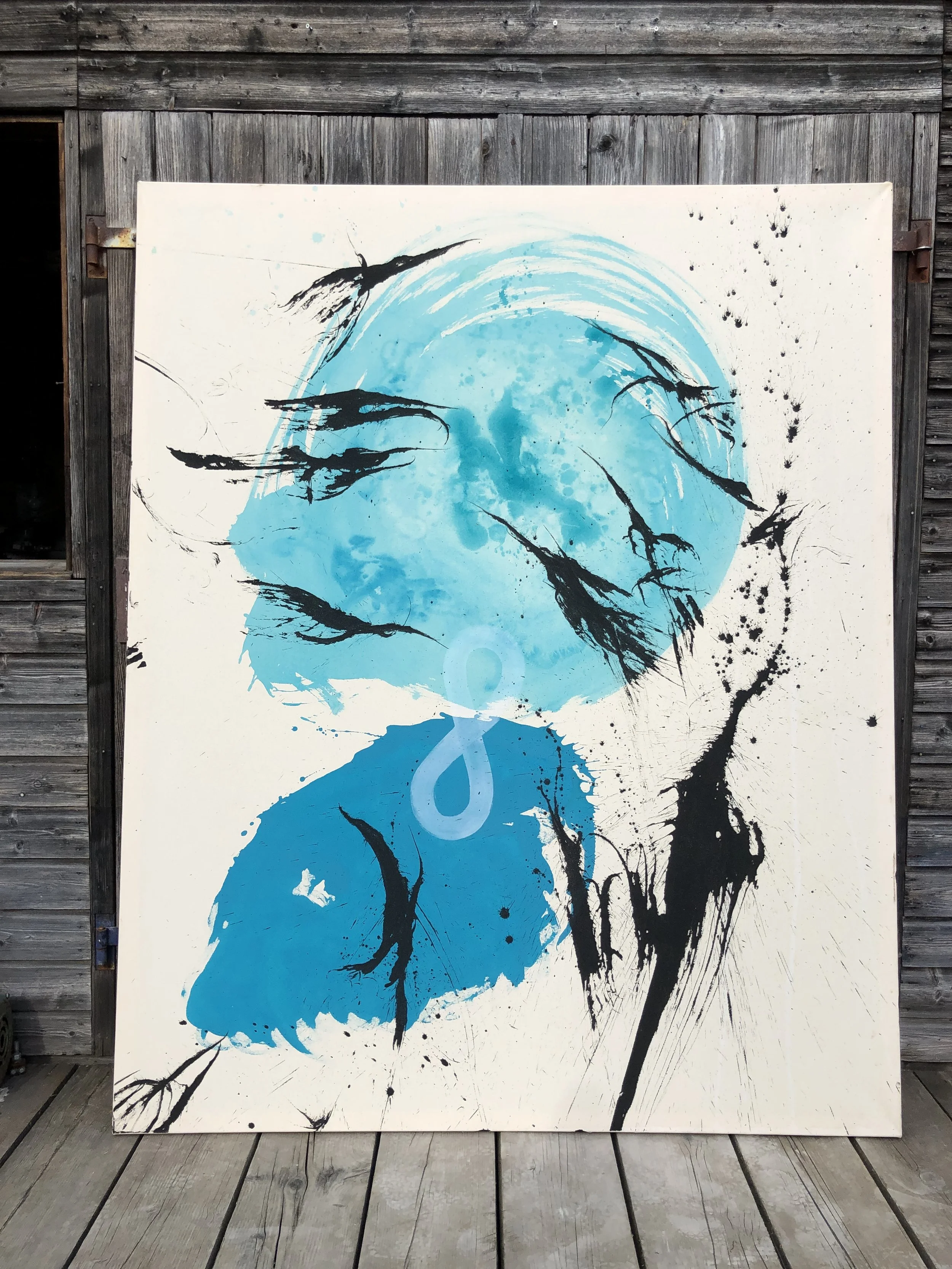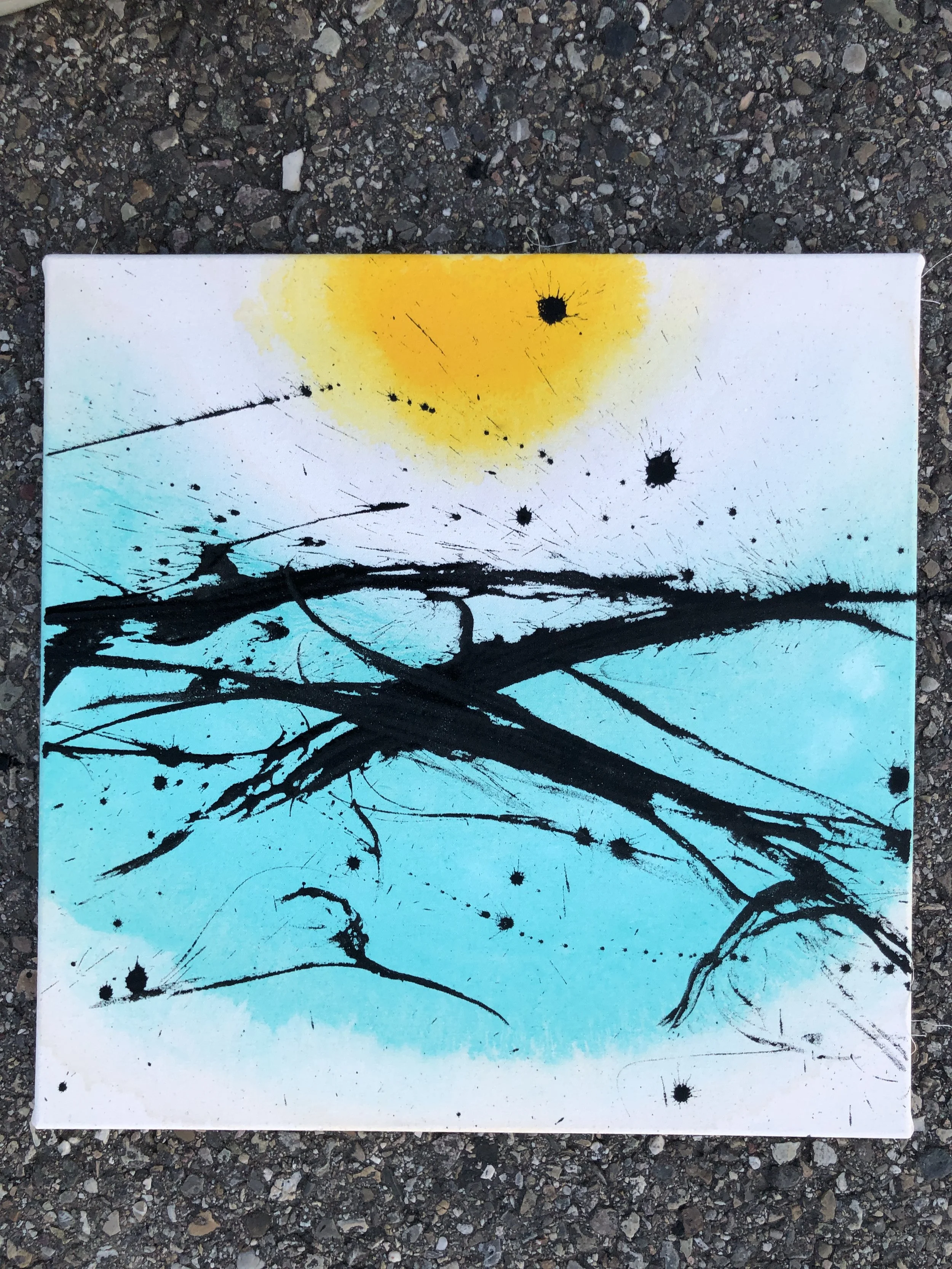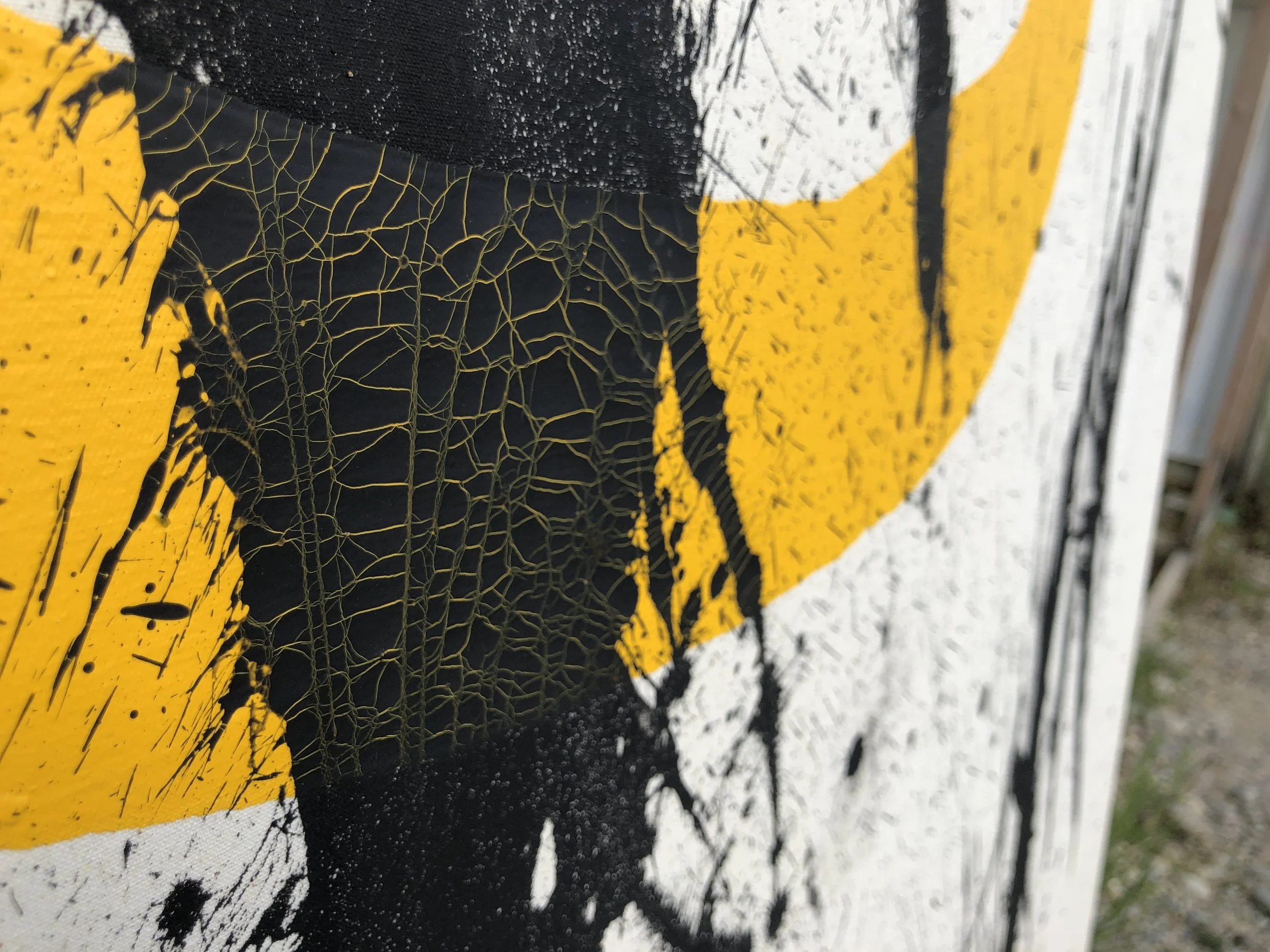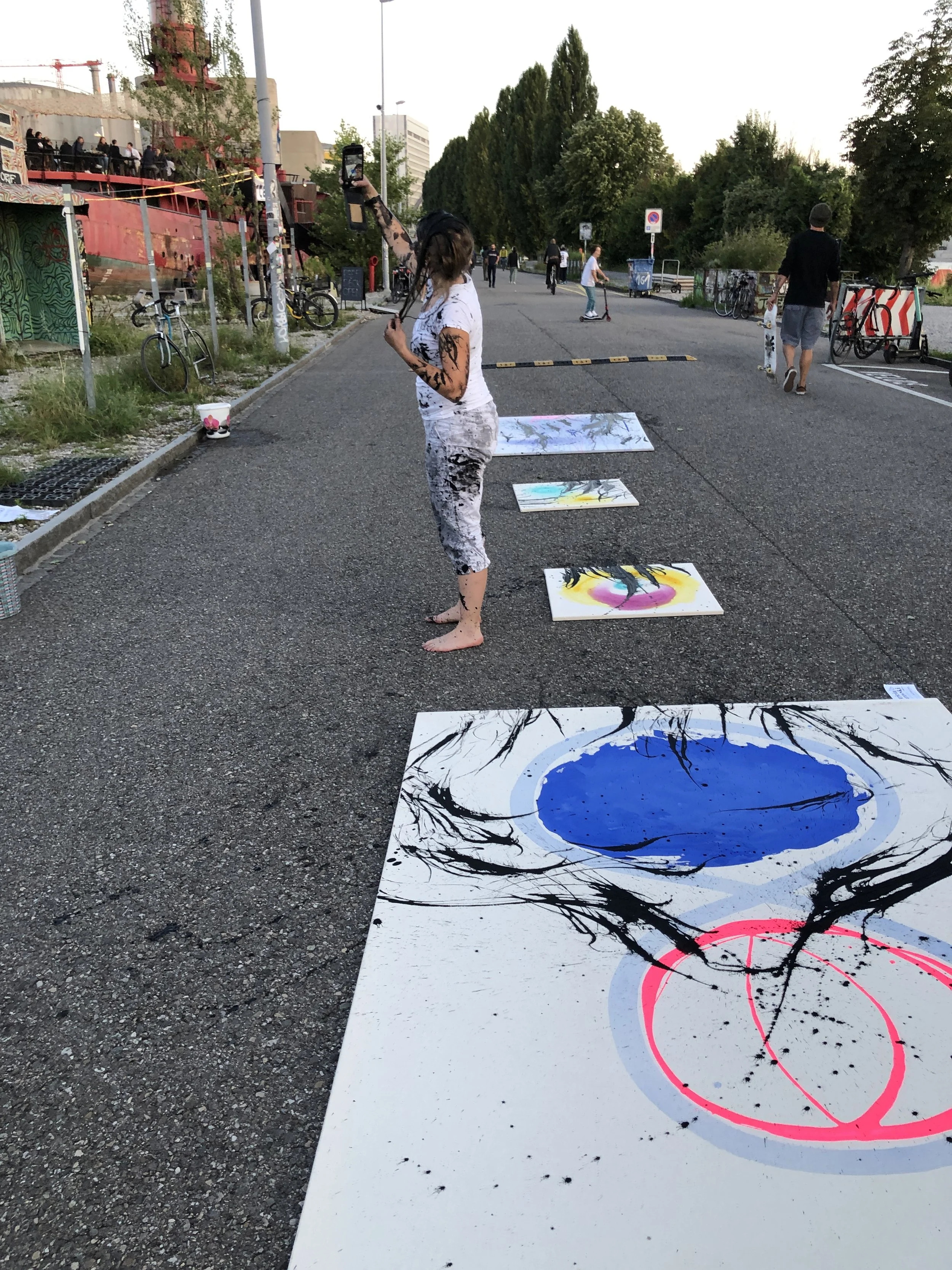 Nachdem ich mehrere Tage die großen und auch kleinen Keilrahmen vorbereitet habe, ordnete ich alle Bilder der Straße entlang an und nahm mir so viel Platz, wie ich wollte und wie ich brauchte.